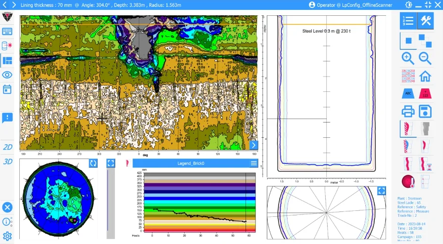 Our 5th-generation LaCam® 3D software suite is a powerful collection of tools to analyze data streams produced by our LaCam® laser scanners and provide a virtual 3D inspection of any vessel. The software visualizes refractory lining wear, wear rates, vessel volumes, and vessel deformation. In addition to information about distance, LaCam®-3D also provides an absorption or reflection value and the absolute temperature for each point. Secondary information, including the bath level for freeboard determination, can also be determined. This software enables our customers to maximize vessel life and optimize the consumption of gunning mixes by determining area-specific uses. It also provides brick consumption trend analysis and campaign life predictions.