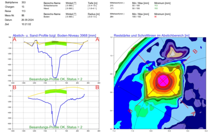 Our 5th-generation LaCam®-3D software suite is a powerful collection of tools to analyze data streams produced by our LaCam® laser scanners and provide secondary information for an optimal sand-filling process through tapping-angle optimization and retained steel minimization in a ladle or converter. Bath level calculations are used for freeboard determination. The software uses composite information based on refractory thickness, absorption, and temperatures in order to detect gaps and cracks.